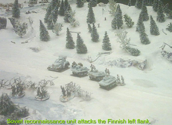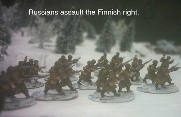 The Russians attack the Finnish positions (15mm scale) Russian T-28s advance against Finnish positions (15mm scale) A Winter War display game from the Adelaide Mongrels (15mm scale) This shot of the Eastern Front battle didn't make it into the rulebook (10mm scale)