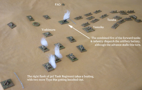 The Japanese 3rd Tank Regiment was now 7/6 away from its breakpoint, meaning its commander, Yoshimaru, would have to motivate his troops at the start of the next turn in order for them to continue fighting.