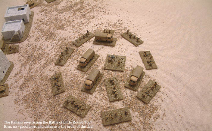 The Italians, not to be outdone by some obsolete armoured cars and a few infantry in carriers, showed their determination and some managed to exit the table together with the remaining trucks! The artillery observers pulled-back to the high ground near the Italian baseline.