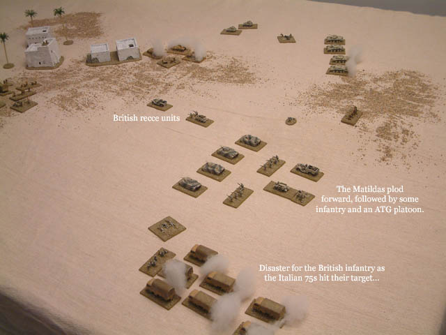At the rear, the British recce (what, may you ask, was reconnaissance doing at the rear?) raced foward in the centre - penants waving in the wind. The infantry battalion, with few survivors, was as good as out of the battle, so nothing more from them this game. The Matildas and accompanying infantry, however, continued to plod forward, reaching the gentle slopes of the high ground where the Italian infantry began the battle.