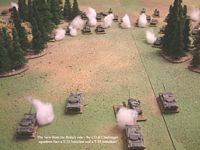 The British edged on the table in the centre with the CO and the Challengers. They were already in range of the Soviet tanks, so didn't want to race too far onto the battlefield. Both sides stayed-put in the centre for the duration of the battle, apart from the Challengers edging foward slightly to close the range to half-distance. They out-ranged the Soviet tanks 100cm to 60cm.