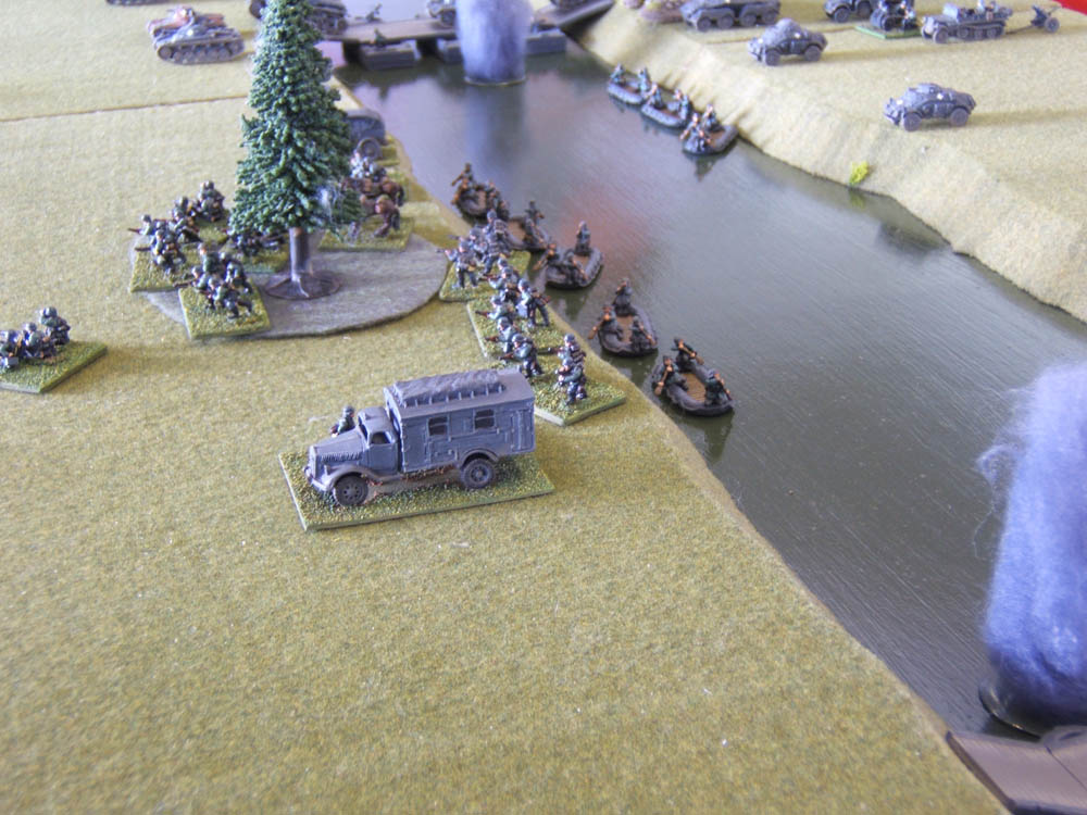 The Recce battalion and Panzer battalion I are on table behind the river at the start of the game. Any mounted or truck-borne units may be deployed or dismounted at game start. 4 assault boats are ready in the water, and 4 more wait in 2 wagons on the riverbank. A vehicle bridge and an infantry bridge are unloaded at the riverbank and work is about to start.