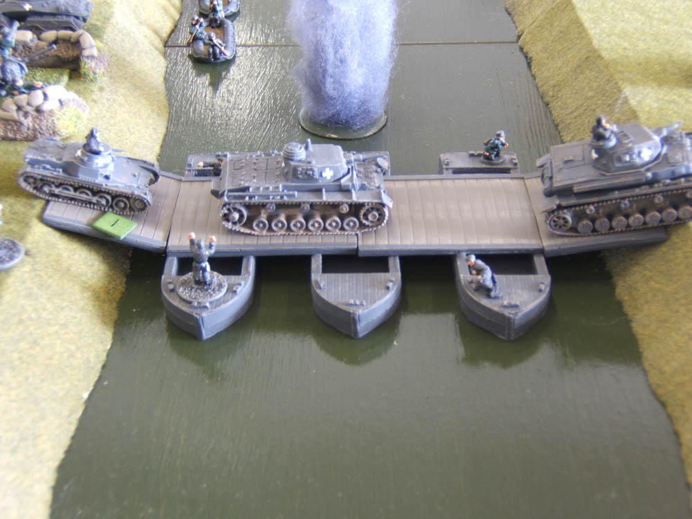 Infantry bridges are hit on a 5,6 and take 4 hits. At least 5cm of the bridge must be within an artillery or air fire zone to take hits. Fire against a bridge is taken to include fire against engineers on and around it, but these troops are not represented.